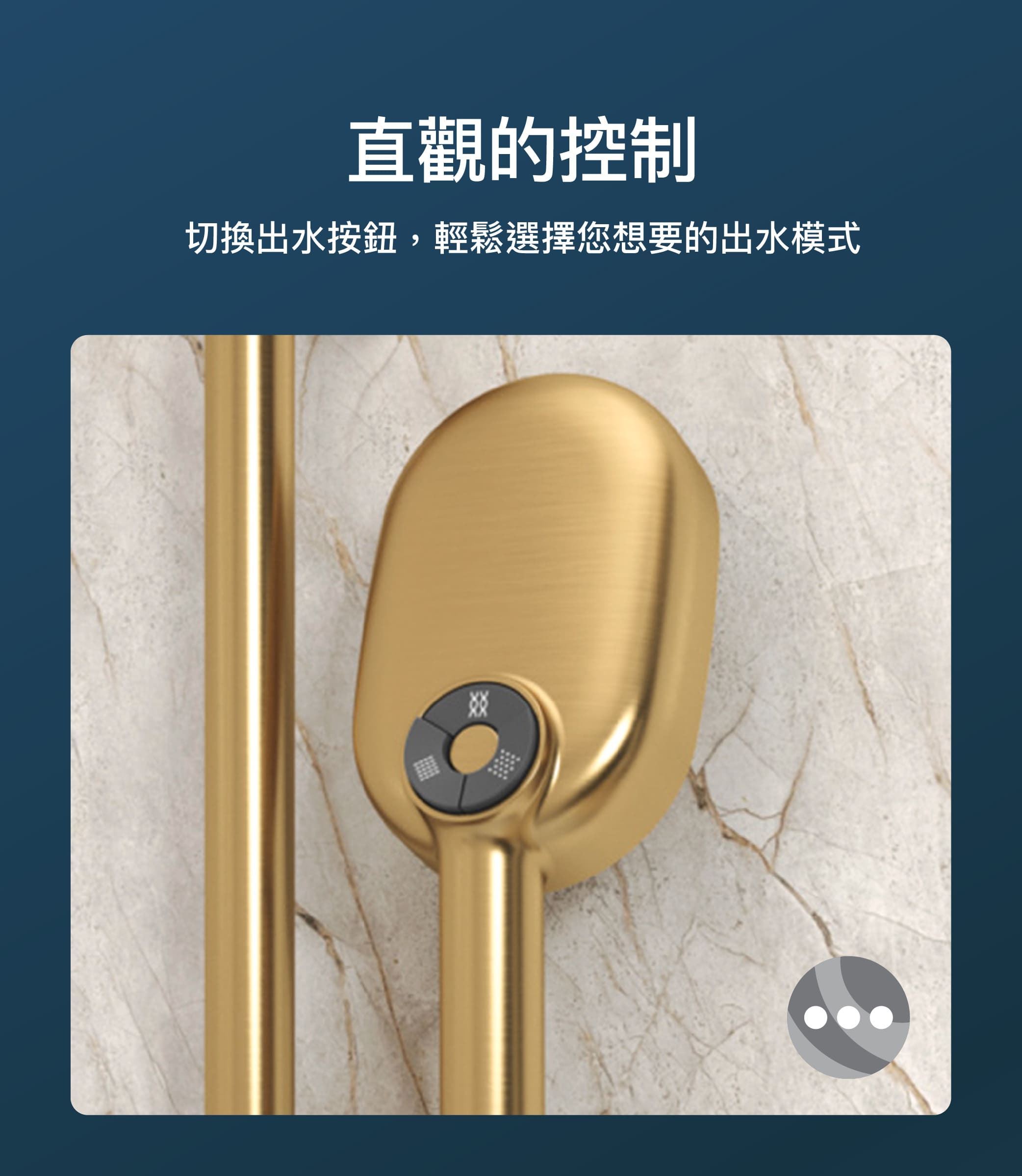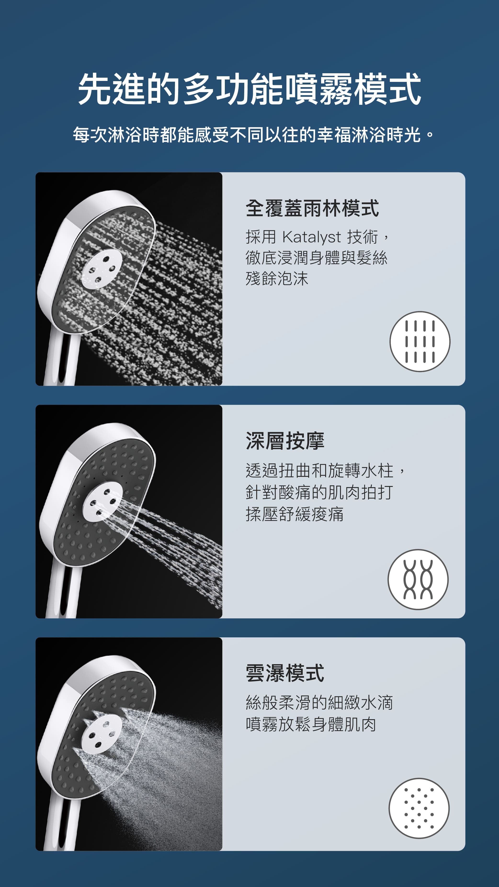 - 配備先進噴灑動力的多功能手持花灑,提供三種噴灑體驗:全覆蓋Katalyst親氧科技技術、DEEP MASSAGE深度按摩模式和CLOUD雲瀑模式。