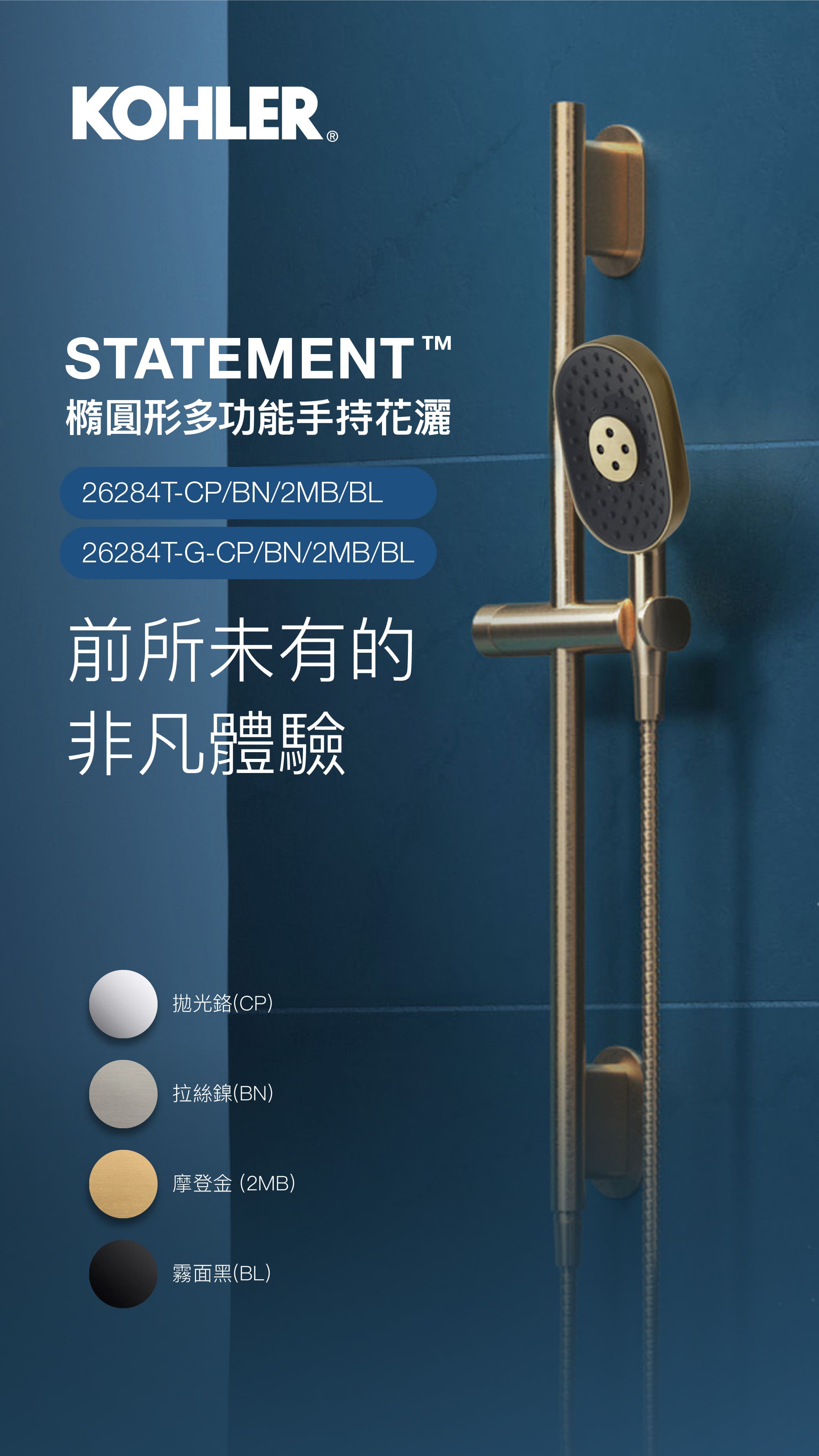 - KOHLER採用防鏽蝕且防變色的表面處理。