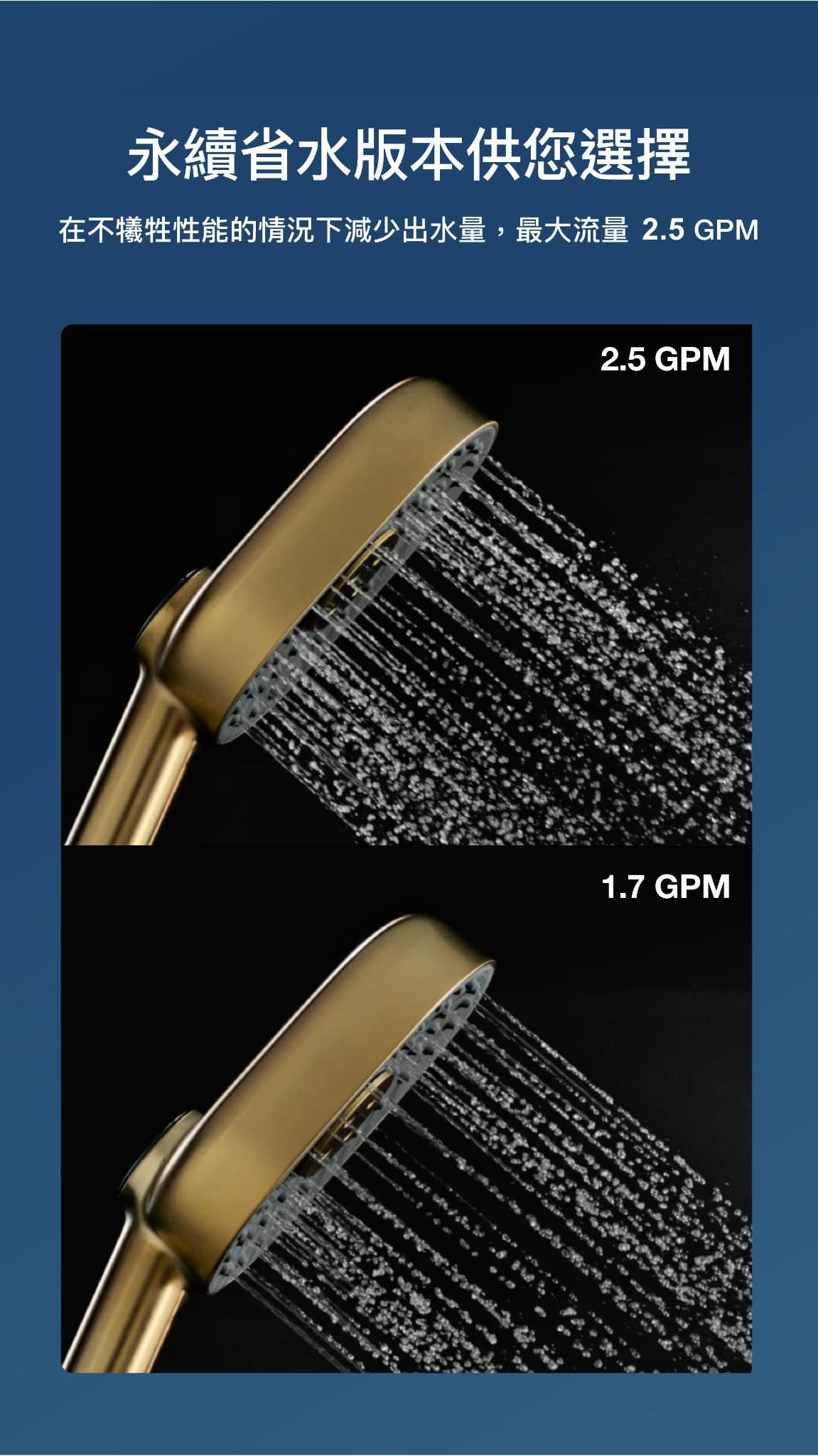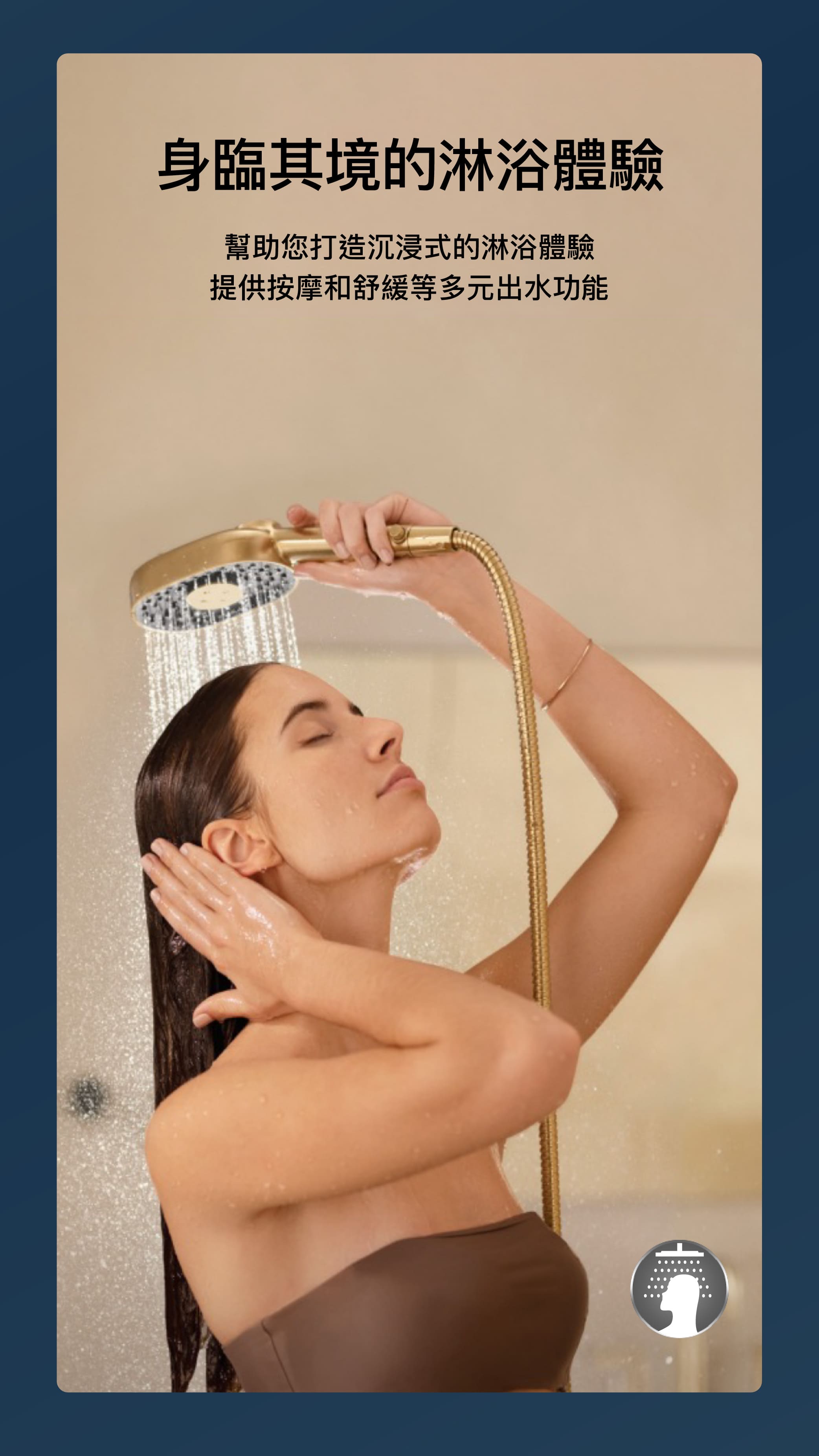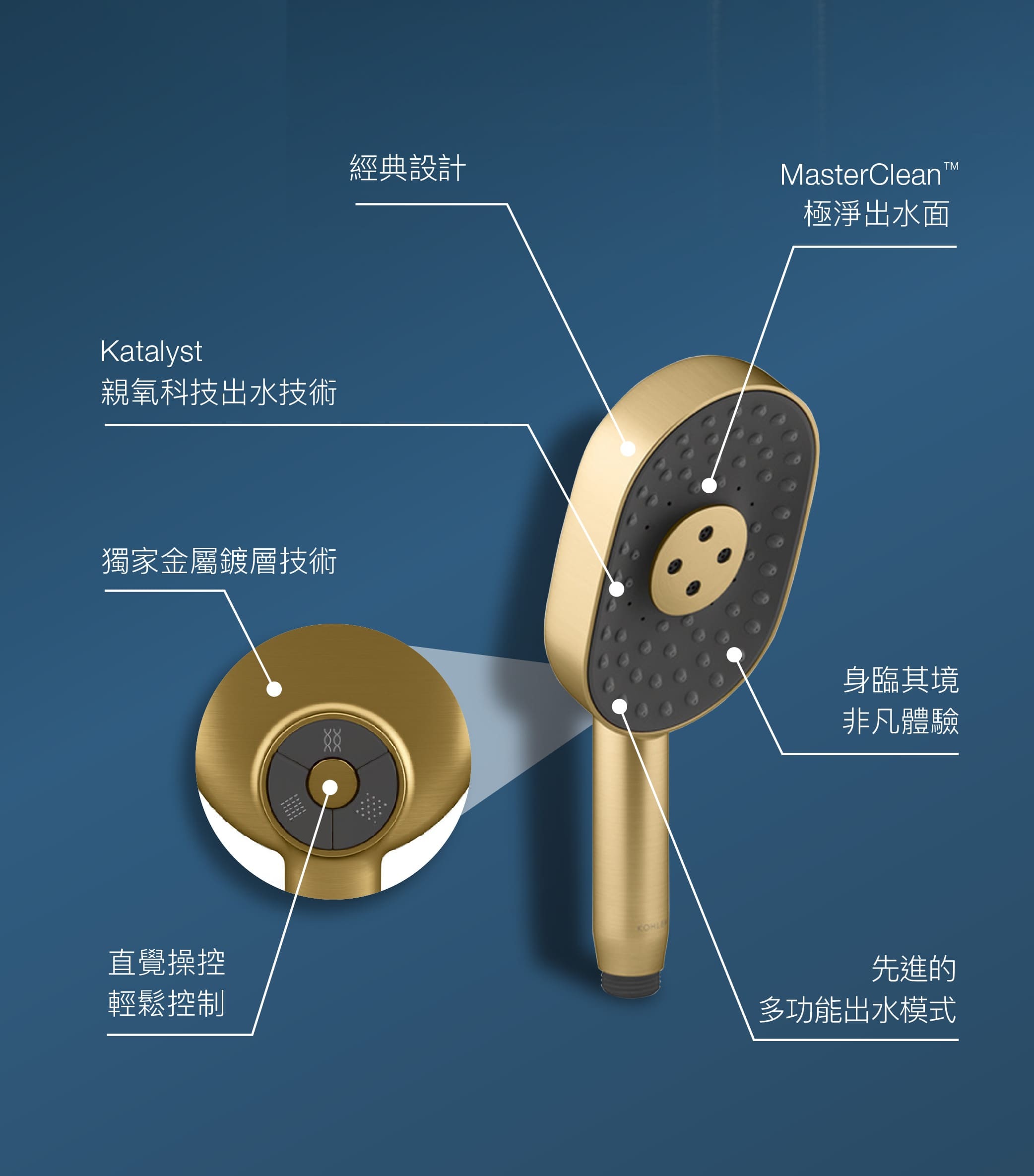 - 配備先進噴灑動力的多功能手持花灑,提供三種噴灑體驗:全覆蓋Katalyst親氧科技技術、DEEP MASSAGE深度按摩模式和CLOUD雲瀑模式。