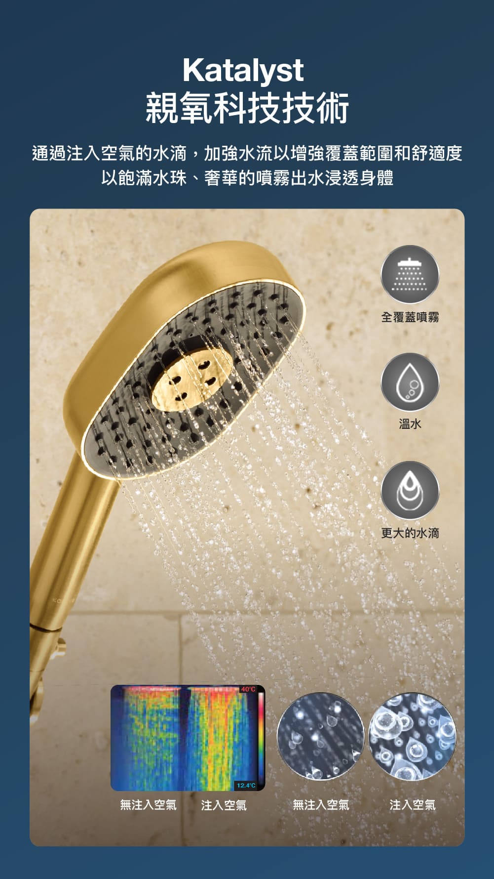 - 花灑採用全覆蓋Katalyst親氧技術,沉浸式的噴灑體驗,針對頭髮上的洗髮用品能夠均勻且徹底洗淨。