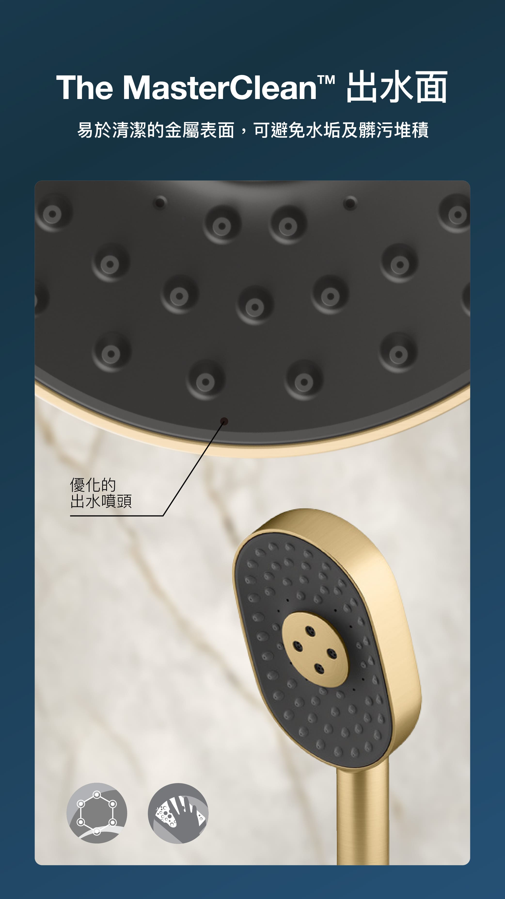 - MasterClean™表面採用易清潔表面處理,減少長時間使用礦物質累積等水垢孳生情形。